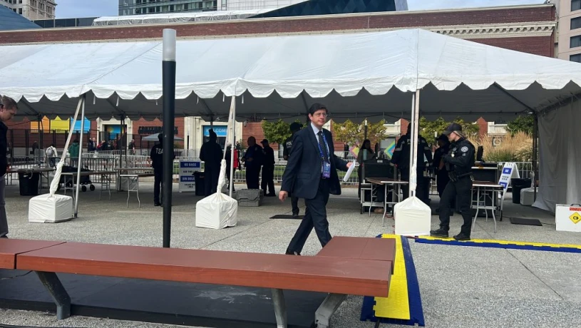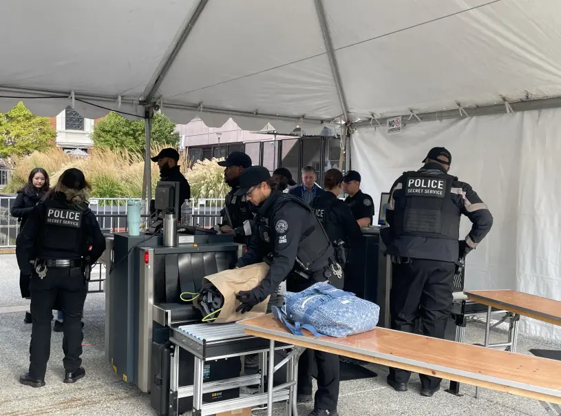 APEC大会第五天,会场莫斯孔尼中心附近安检明显比前两天升级,只留香叶园艺术中心广场(Yerba Buena Center for the Arts )一个出入口,共设三道安检关卡,第一关是所有物品放入运输带过机进行透视检查,第二关是自动读卡器,所有证件的照片和信息会显示在屏幕,第三关是摄影器材及脚架等接受人手检查。