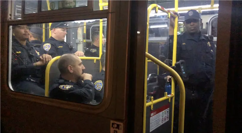 为维持APEC会议安保,旧金山出动大批警力,14日拜登总统和中国国家主席习近平先后抵达旧金山后,记者看到当局出动公交车搭载警员离开。