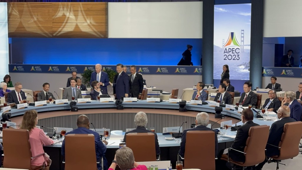 会议现场设有圆桌,各个APEC成员经济体代表均会坐在一起开会。现场所见,国家主席习近平的右边是智利总统柏瑞克,之后是加拿大总理杜鲁多; 左边是陈茂波,再过去是印尼总统佐科·维多多、日本首相岸田文雄。而美国总统拜登的右边是越南国家主席武文赏、左边是澳洲的代表。