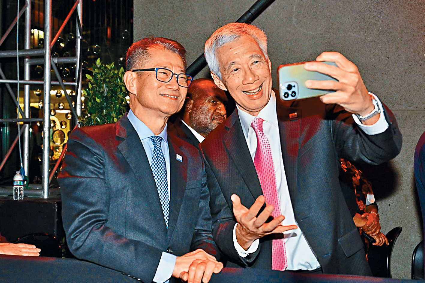 财政司司长陈茂波继续在美国旧金山的行程,当地时间前晚(15日)出席APEC领导人非正式会议欢迎酒会,其间与新加坡总理李显龙“玩自拍”,并与印尼总统佐科.维多多、澳洲总理阿尔巴尼斯、菲律宾总统马科斯及秘鲁总统博鲁阿尔特等交谈。