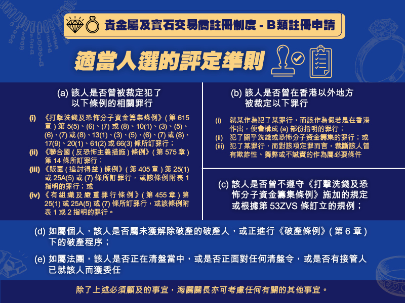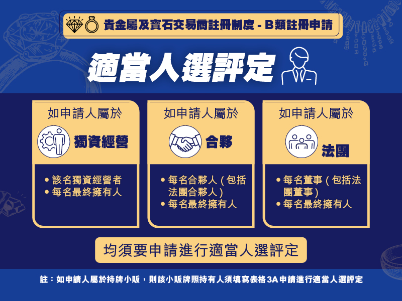 海关关长仅在信纳持牌小贩/ 独资经营者的申请人/ 申请人的每名合伙人(包括法团合伙人) / 每名董事(包括法团董事)及每名最终拥有人(如有)属“适当人选”的前提下,才会批予申请人注册为B类注册人。