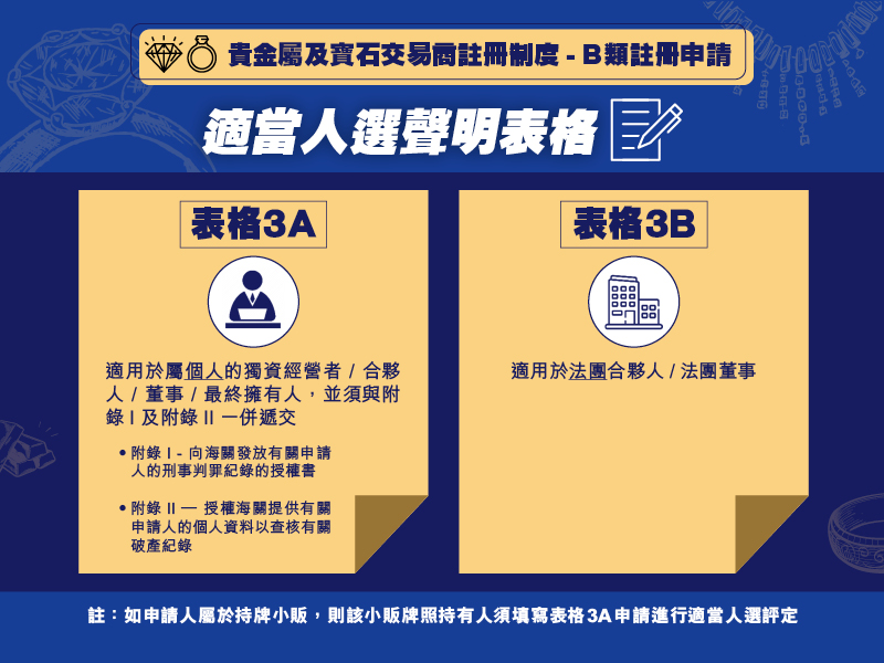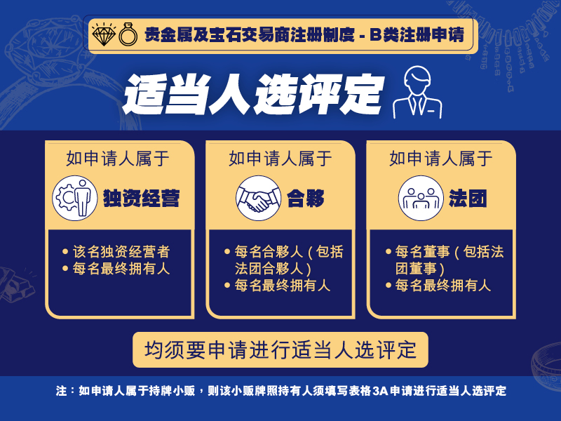 因此,B类注册的申请人须进行适当人选评定,每位符合适当人选的人员须填写适当人选声明表格。