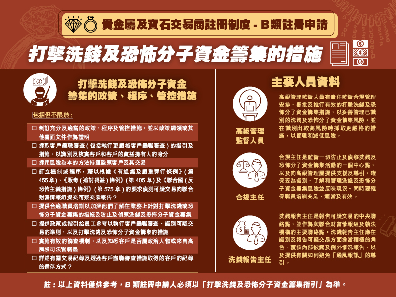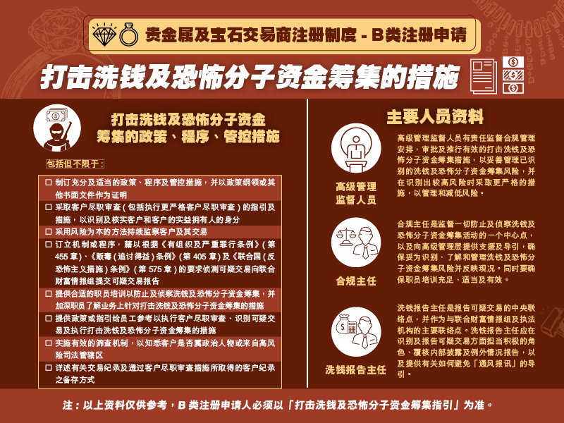 B类注册申请人需制订一套有效的打击洗钱及恐怖分子资金筹集措施,以减低申请人面对的洗钱或恐怖分子资金筹集风险。