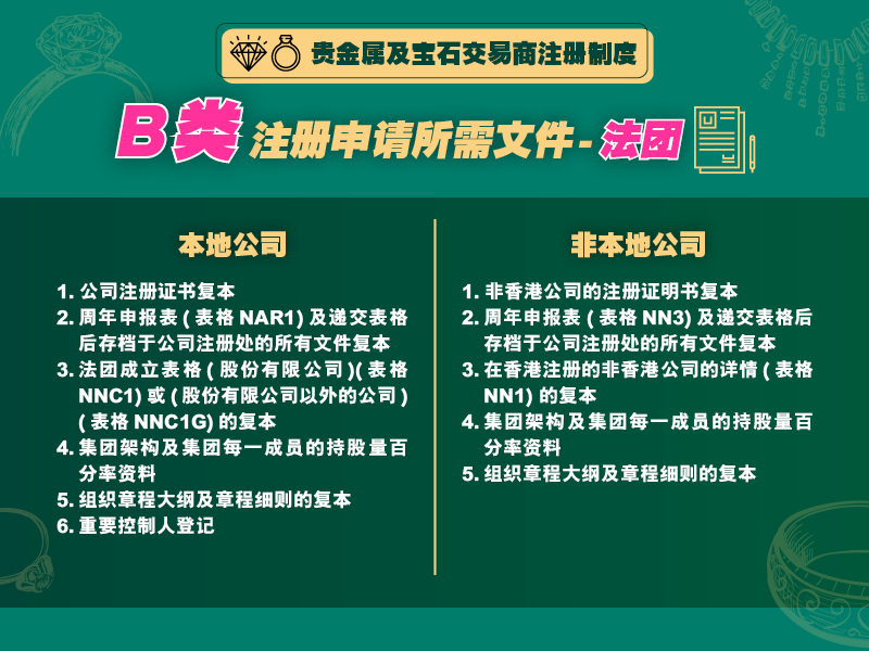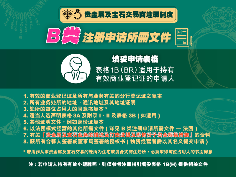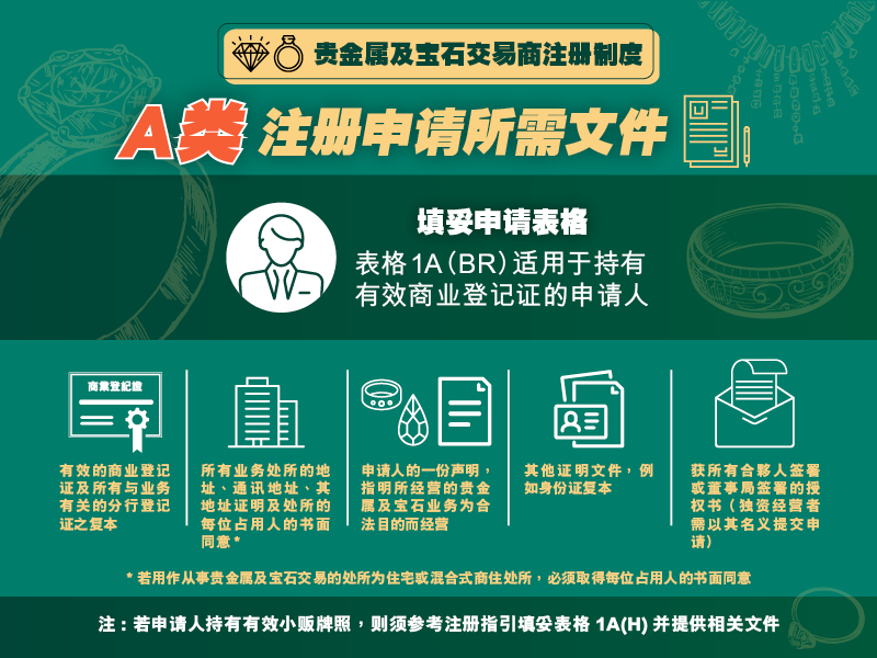 A类注册申请较为简单,交易商只需填妥申请表格、提供其他相关文件及提交一份声明,指明所经营的贵金属及宝石业务为合法目的而经营,即可递交注册申请。