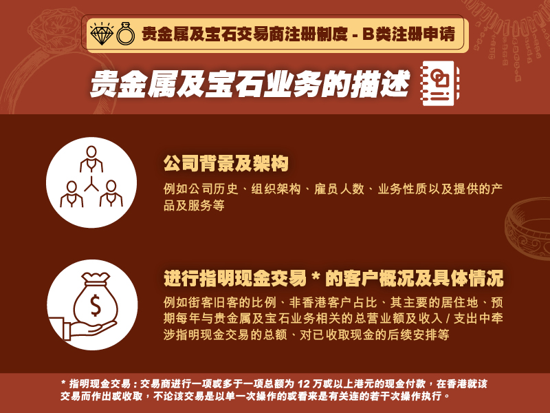 (b) 任何交易商有意在业务过程中,进行总额为12万或以上港元的现金交易(指明现金交易)及总额为12万或以上港元的非现金交易(指明交易),必须注册为B类注册人,并须遵守打击洗钱及恐怖分子资金筹集规定。