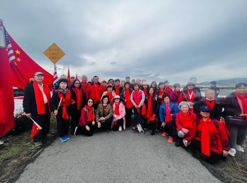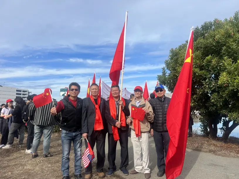 ▲大批侨胞在旧金山国际机场外的海傍挥舞五星红旗,准备欢送习近平主席。