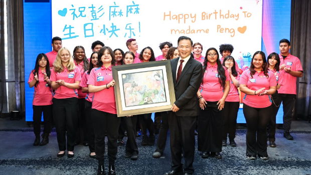 活动上,林肯中学合唱团的学生送上像征友好、和平的手绘画作《一起向未来》。 图画中,大熊猫、牌楼等中国元素显著,与土拨鼠、太空针塔等华盛顿州的标志性元素完美融合,表达出林肯中学师生对中国的向往和热爱,以及对中美友谊长存、携手绘就美好未来的热切祝愿。 过几天是习近平主席夫人彭丽媛的61岁生日,同学们送上用心制作的生日贺卡,亲切地祝“彭麻麻”生日快乐,并以阿卡贝拉的方式演唱了《生日快乐》歌。