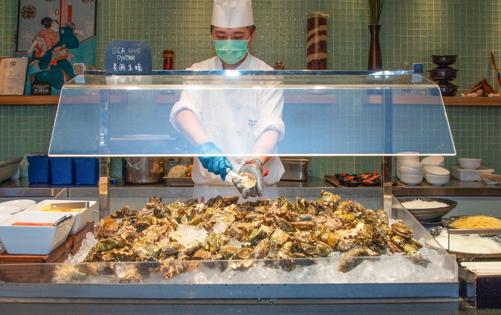 湾仔诺富特世纪酒店咖啡厅生蚝海鲜自助午餐除了有任食冰镇海鲜,如生蚝、冻虾、青口、翡翠螺等,亦有多款刺身寿司、烟三文鱼、肉眼扒及小朋友最爱的即制石炉意式薄饼,更有多款Mövenpick口味雪糕及十数款甜品; 而“东瀛の味自助晚餐”主打以竹炭入馔的美食,包括竹炭炸虾天妇罗、竹炭雪芳蛋糕,亦可即制竹炭烟燻饭团,更可自选配料,包括有和牛、带子、吞拿鱼蓉、鳗鱼、三文鱼松及辣子鸡肉。 当然亦少不了冰镇海鲜,包括任食阿根廷红虾刺身、即开生蚝、冰镇鳕场蟹脚、青口等。