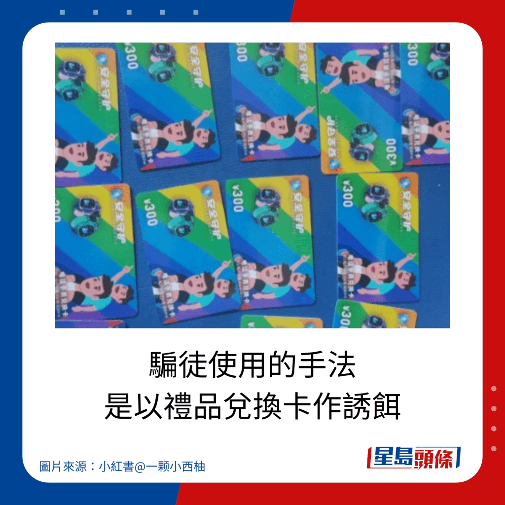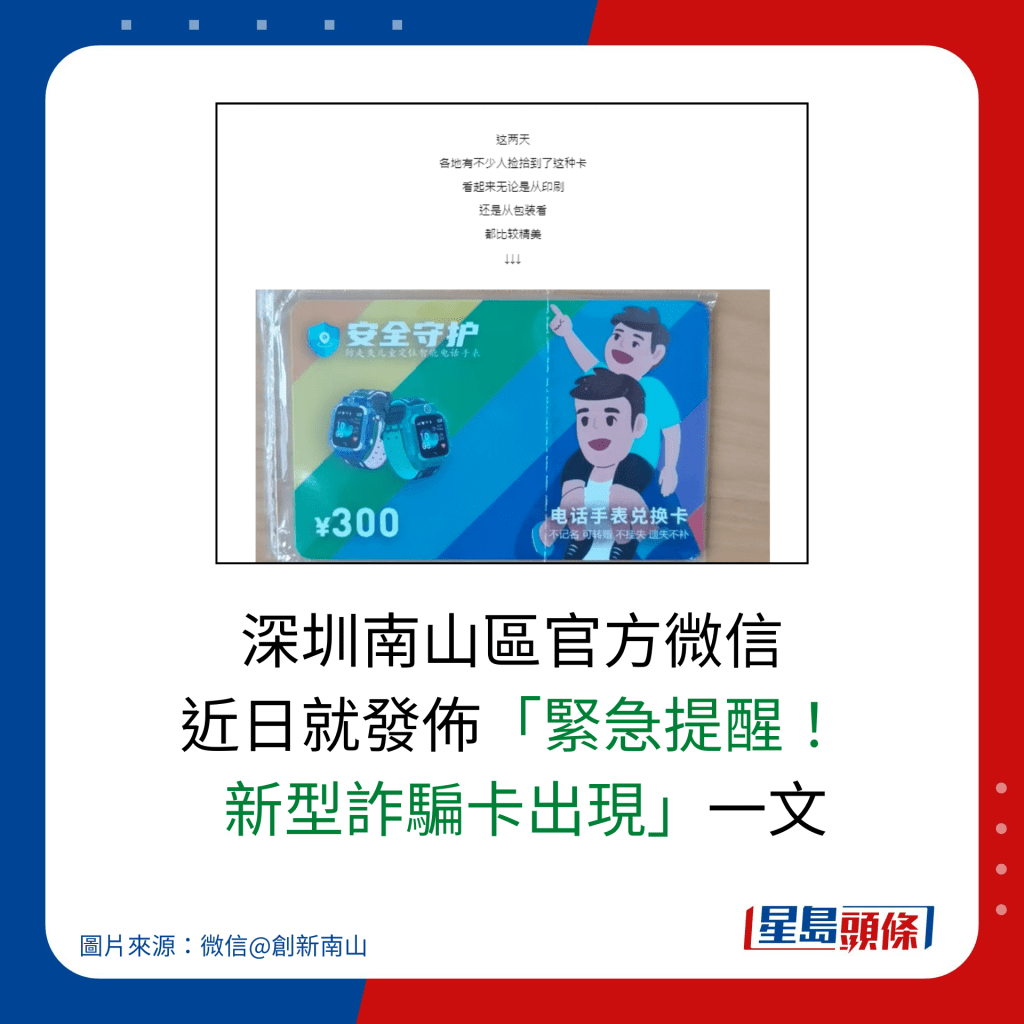 深圳南山区官方微信昨日(11月19日)发出“紧急提醒”文章,指市面出现了“新型诈骗卡”。 近日陆续有市民在街头巷角捡获一款礼品卡,礼品卡面值人民币 ¥300,可兑换“防走失儿童定位智能电话手表”。 卡上表明是“不记名 可转赠”,只要执拾到就有资格使用。 礼品卡表面看起来可信度甚高,但经官方查证,礼品卡是骗徒的诱饵。