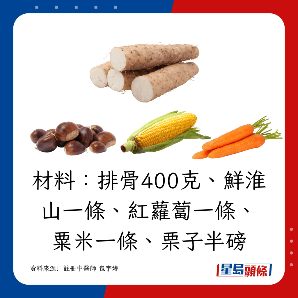 党参杜仲淮山瘦肉汤、鲜淮山红萝卜栗子粟米排骨汤的功效、材料、做法: