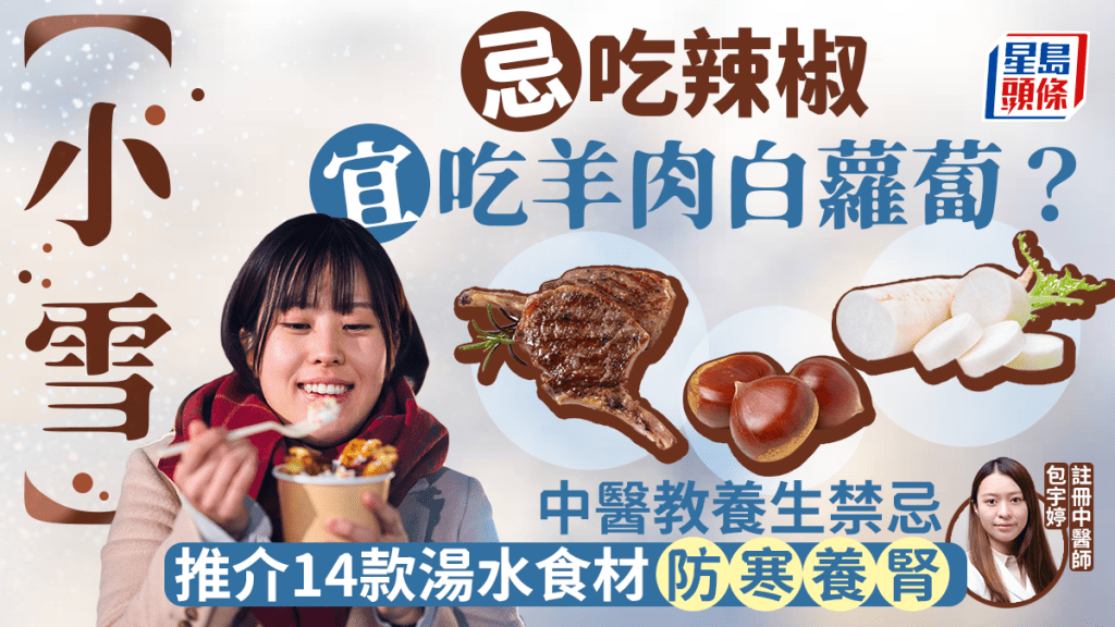 今天(11月22日)是二十四节气的“小雪”,属于冬季的第二个节气。 注册中医师包宇婷接受《星岛头条》访问指,小雪期间气温骤降且变得干燥,可引发与血管、呼吸系统等相关的疾病。 包医师教小雪养生宜忌,例如忌吃辣椒,宜吃羊肉、白萝卜。 她亦推介14款防寒养肾的汤水食材,以供大家在小雪节气好好养生。