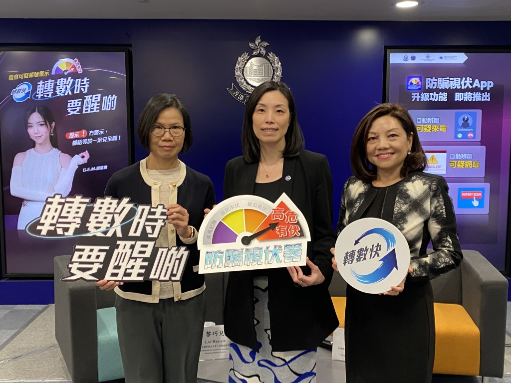 ▲香港金融管理局主管(金融基建发展)黎巧儿、网络安全及科技罪案调查科总警司郑丽琪、香港银行同业结算有限公司行政总裁邓月容(左至右)表示,“可疑识别代号警示”有助市民使用转数快转帐前防范堕入骗局失财。麦键泷摄