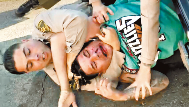 据一名男子的家人称,两名洛杉矶县警在他位于东洛杉矶的家外将其头紧挟于腋下,然后不停地殴打。