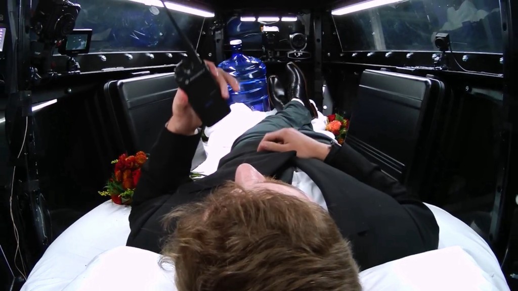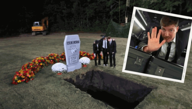 记录影片显示,野兽先生身穿西装躺进透明棺材,抱着一束玫瑰花接受活埋。他的伙伴用挖土机将9吨重的泥土倾倒在棺材上,野兽先生彻底被埋在10呎地底下。