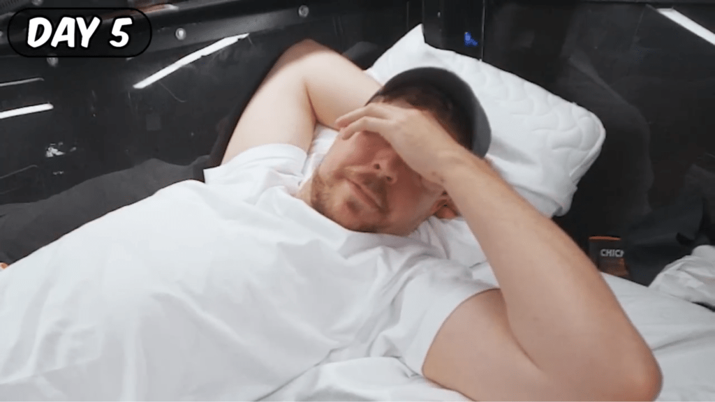 他一开始还兴致勃勃与伙伴们开玩笑、认真吃口粮。但在棺材内只能躺着、弯腰坐,地底又没有互联网,没办法从事任何娱乐活动,野兽先生很快便感到无聊、肌肉痠痛。