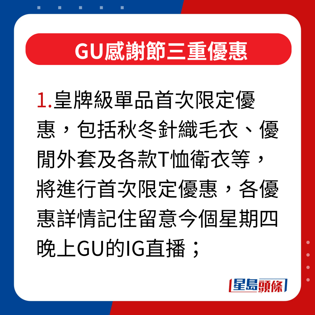 ▲GU感谢节三重优惠,1.皇牌级单品首次限定优惠,包括秋冬针织毛衣、优闲外套及各款T恤卫衣等,将进行首次限定优惠,各优惠详情记住留意今个星期四晚上GU的IG直播;