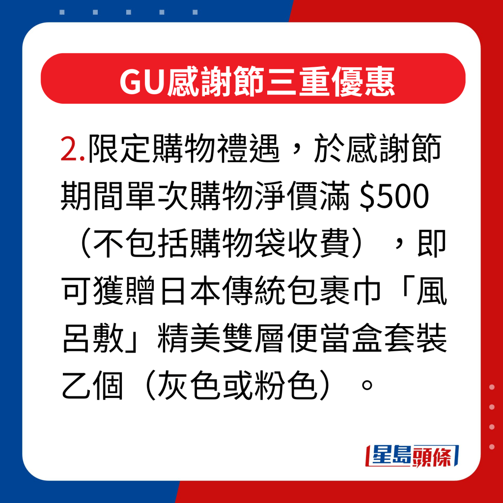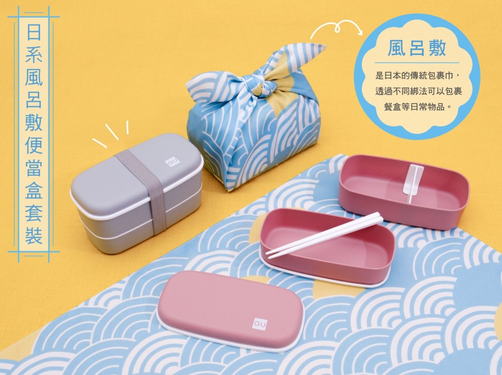 ▲GU感谢节三重优惠,2.限定购物礼遇,凡于感谢节活动期间单次购物净价满 HK$500(不包括购物袋收费),即可获赠日本传统包裹巾“风吕敷”精美双层便当盒套装乙个(灰色或粉色),最适合作为秋游野餐或上班族带饭的之选。