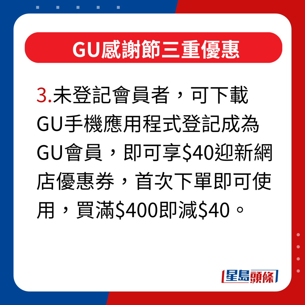 ▲GU感谢节三重优惠,未登记会员者,可下载GU手机应用程序登记成为GU会员,即可享HK$40迎新网店优惠券,首次下单即可使用,买满HK$400即减HK$40。