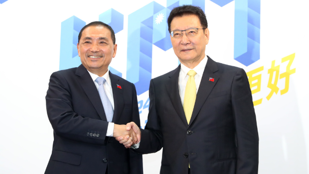 ▲国民党24日举行“中常会”,由侯友宜(左)郑重介绍搭档的副手人选赵少康(右),两人接受媒体访问后再度握手展胜选意志。中时网