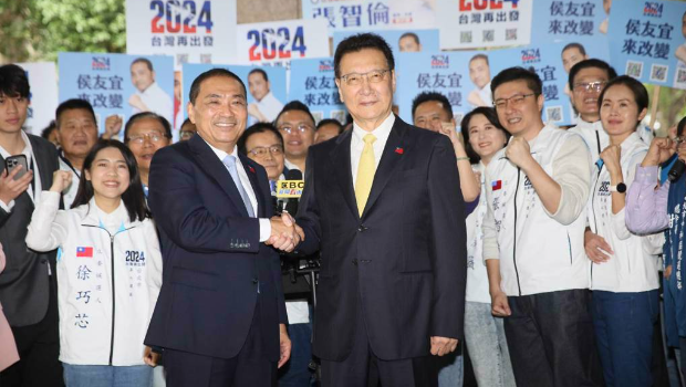 ▲国民党参选人侯友宜与副手赵少康24日到“中选会”正式参选登记。中时网