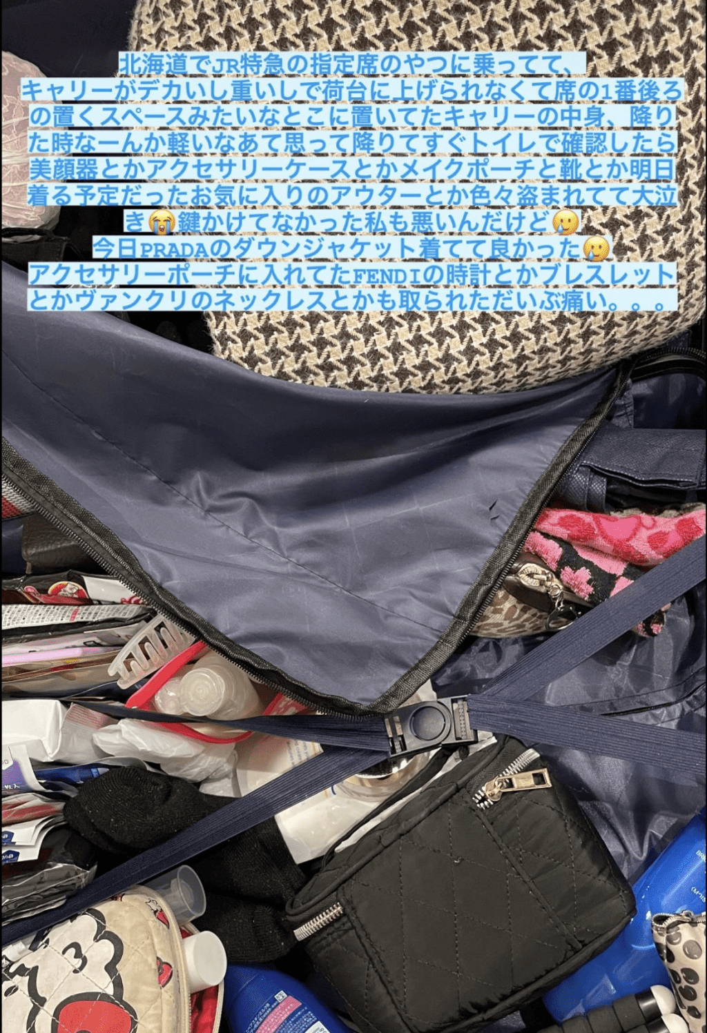 日本AV女优七嶋舞透露,自己在北海道搭乘特快列车时,将行李箱放在车厢前后的置物空间,但落车时却发现行李莫名变轻,因此连忙确认,没想到自己的饰品、化妆品、内衣裤以及衣物竟然被偷,而她再度确认后,还发现其他没被偷走的衣服上竟然留有疑似的精液的不明液体,让她气得报警。