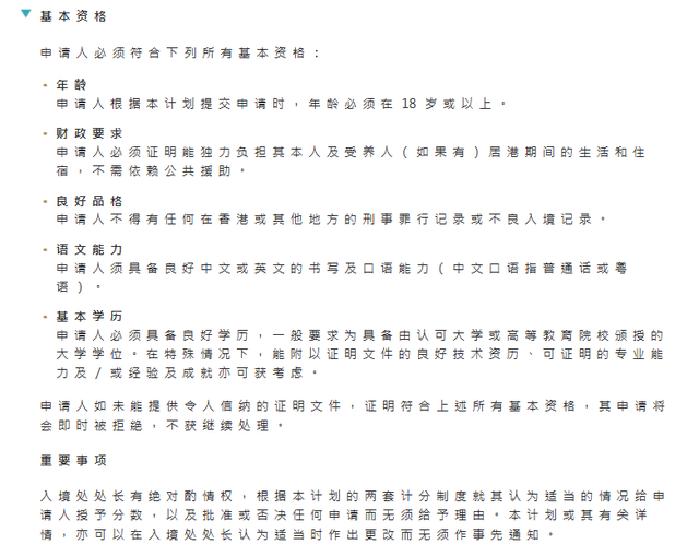 根据本计划提出申请的人士,必须首先符合一套“基本资格”的要求,然后才能根据计划所设的两套计分制度的其中一套获取分数。