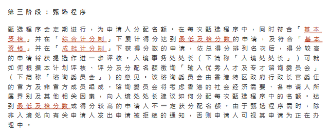 甄选程序会定期进行,为申请人分配名额。在每次甄选程序中,同时符合“基本资格”并在“综合计分制”下累计得分达到最低及格分数的申请,及符合“基本资格”并在“成就计分制”下获得分数的申请,依总得分排列名次后,得分较高的申请将获提选作进一步评核。