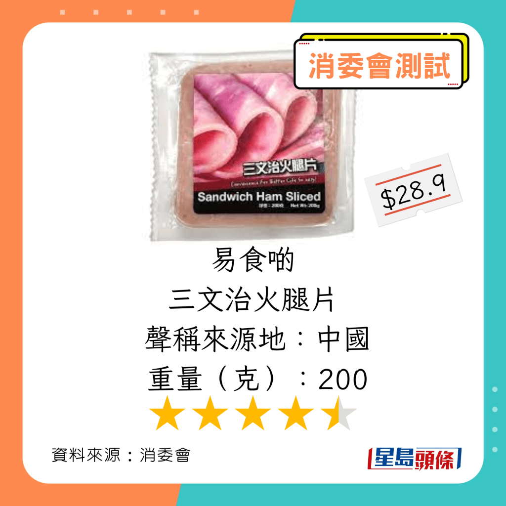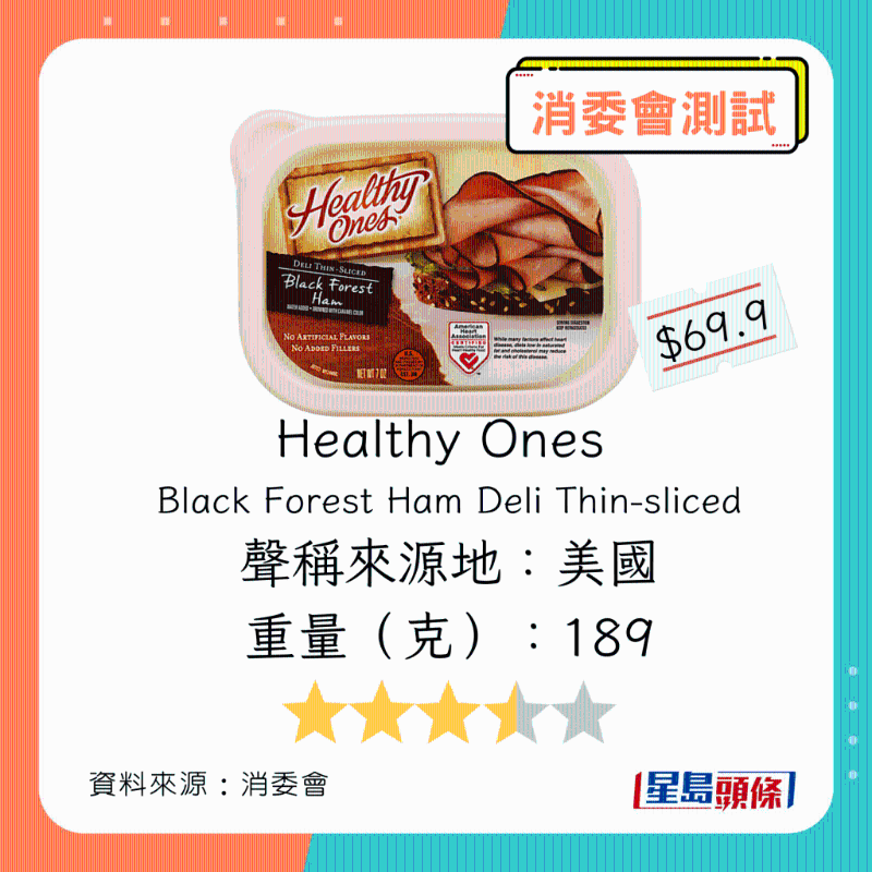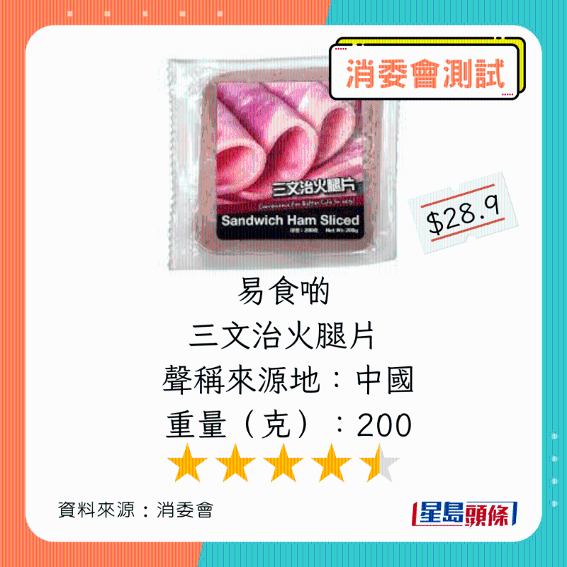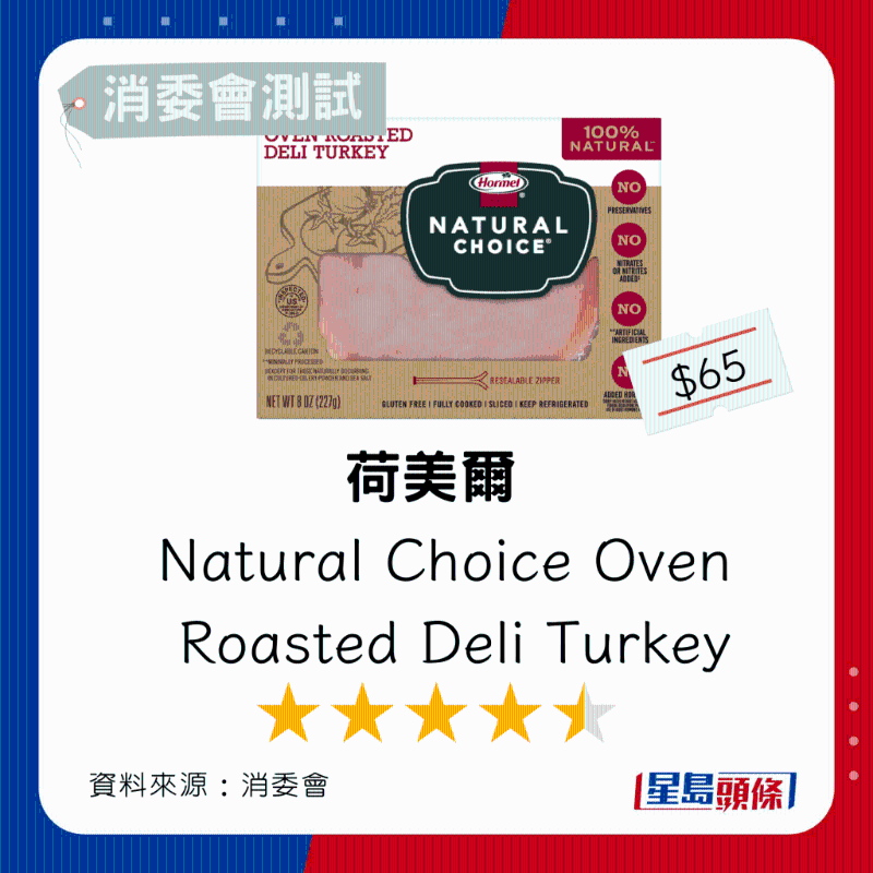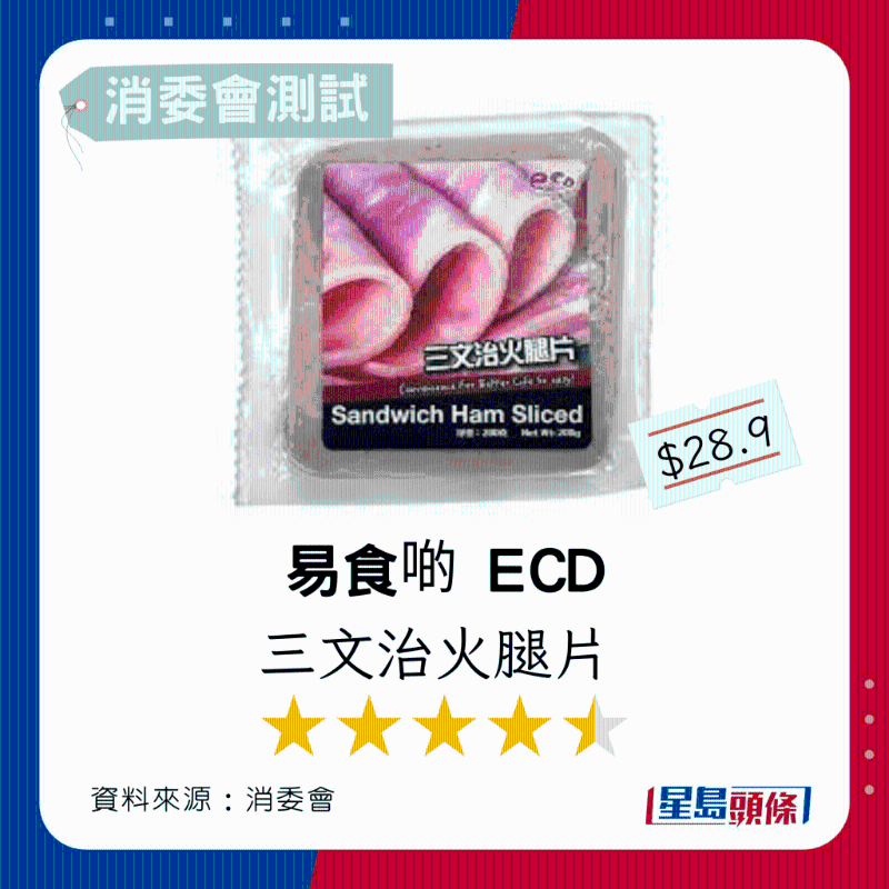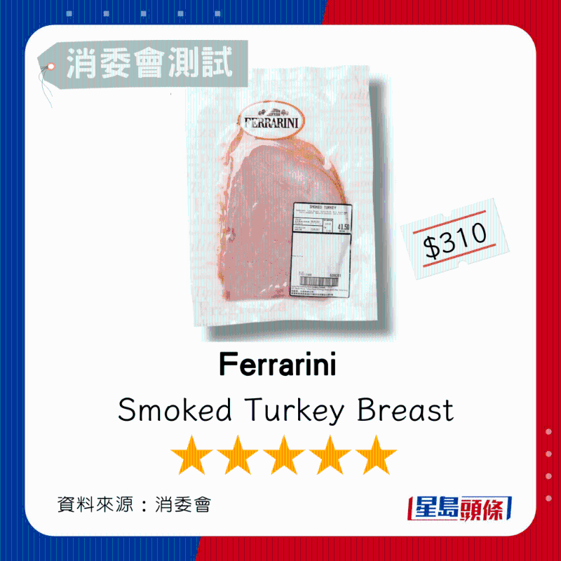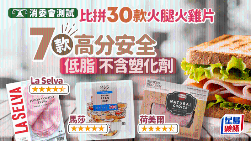 根据《选择月刊》第542期测试报告,消委会早前曾检测市面上23款火腿、7款火鸡片。测试结果显示,在安全及营养方面,有7款火腿、火鸡片总评分获4.5分以上,而且不含塑化剂,较为安全。