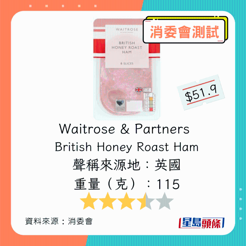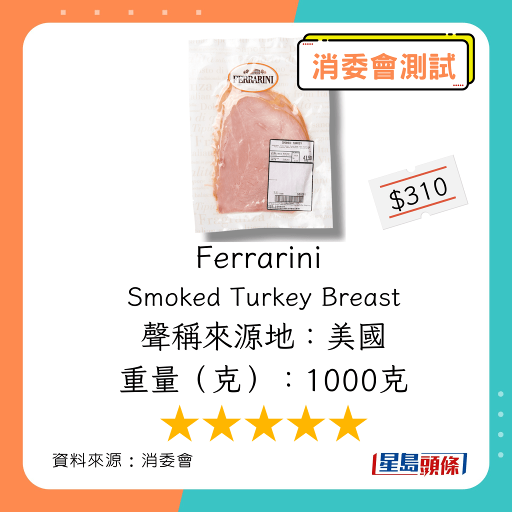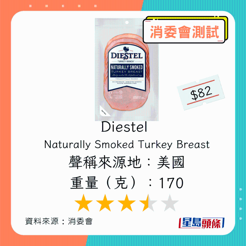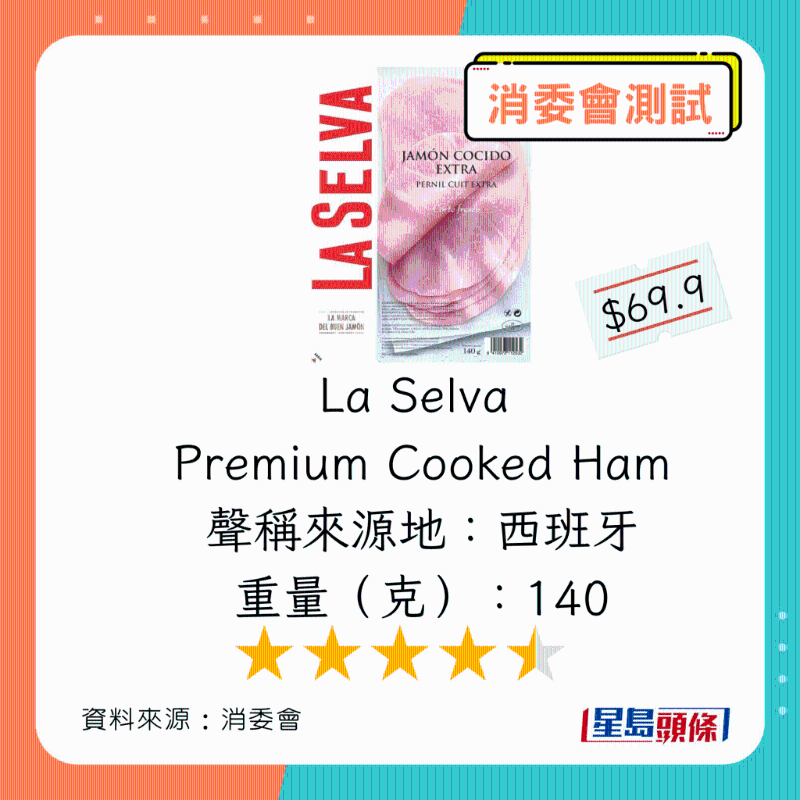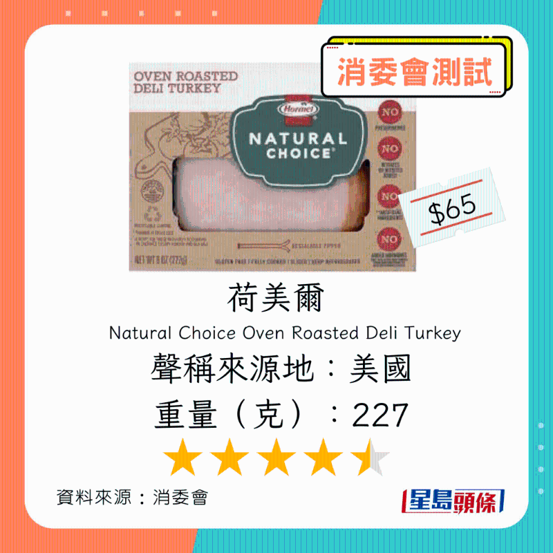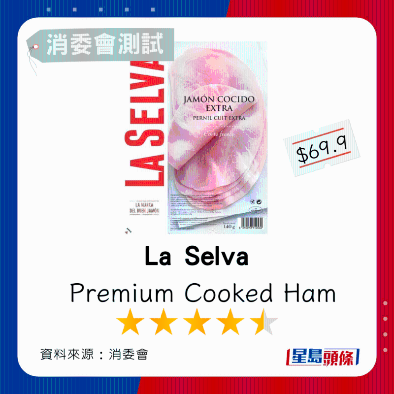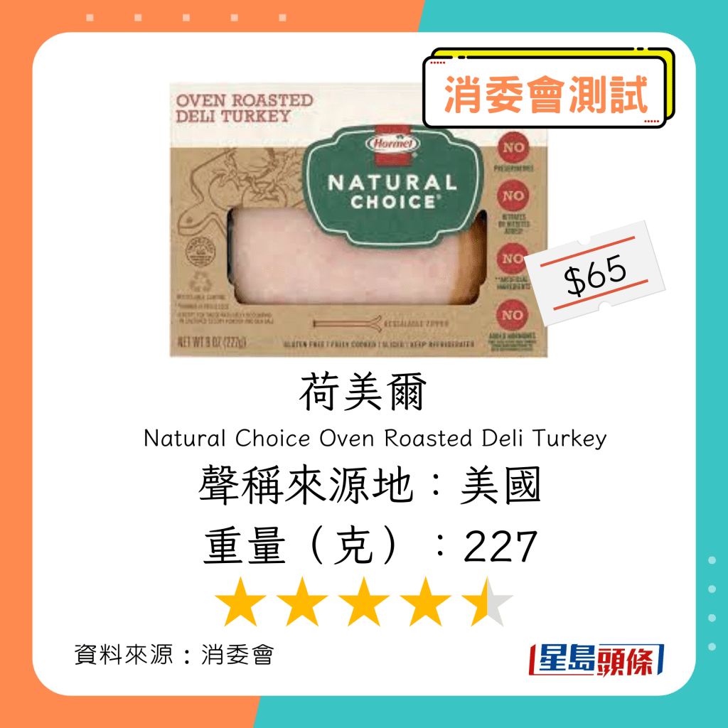 根据《选择月刊》第542期测试报告,消委会早前曾检测市面上23款火腿、7款火鸡片。测试结果显示,在安全及营养方面,有7款火腿、火鸡片总评分获4.5分以上,而且不含塑化剂,较为安全。
