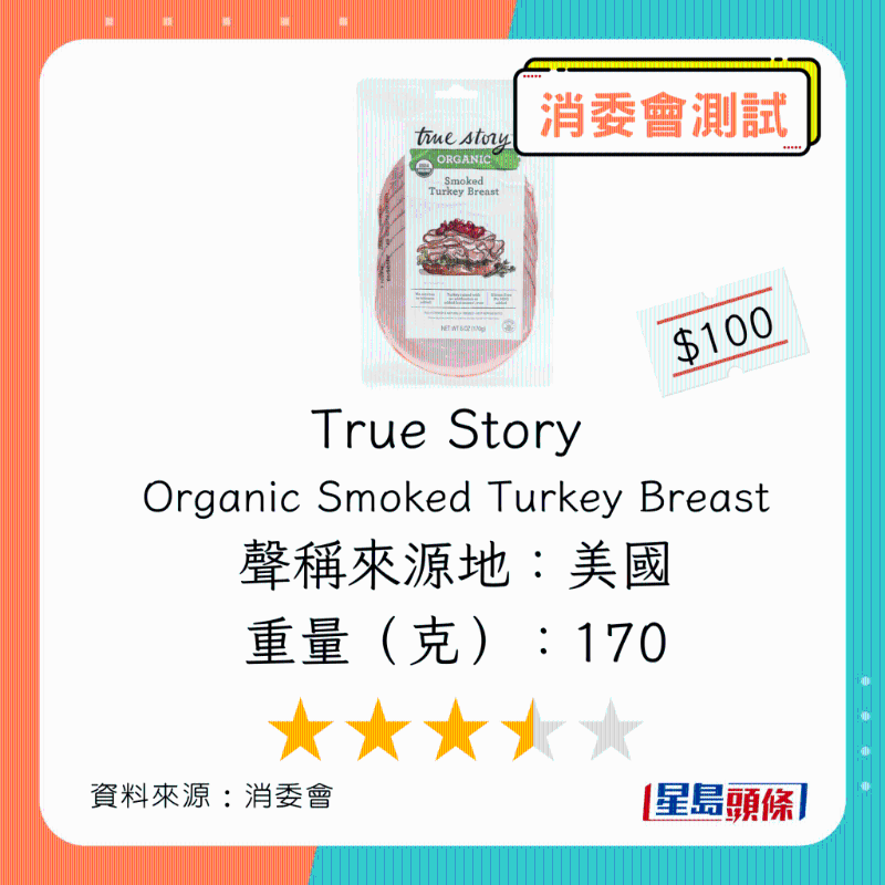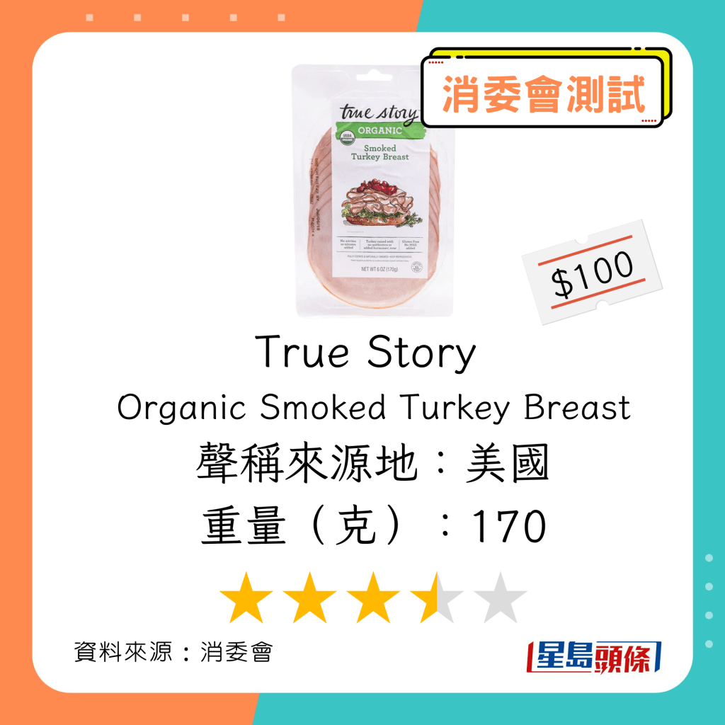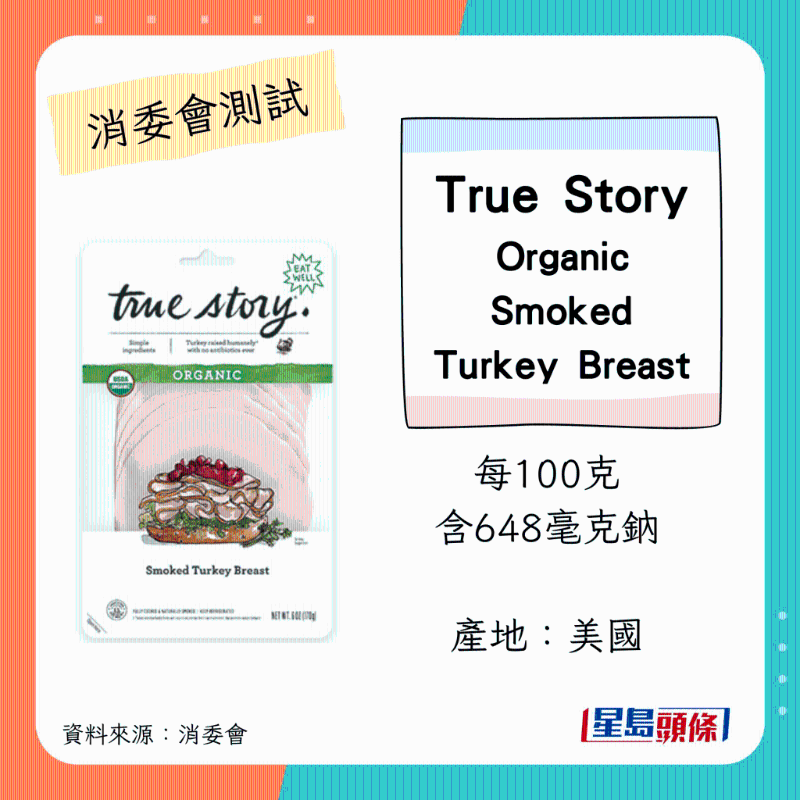 火鸡片钠含量最低:“True Story”Organic Smoked Turkey Breast(每100克含648毫克钠)