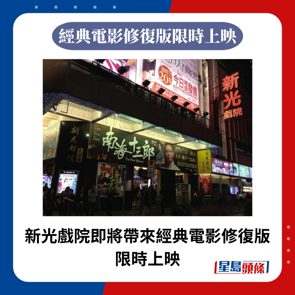 位于北角的新光数码戏院近日在社交平台宣布,即将为大家带来几部香港经典电影的修复版本,当中包括《秋天的童话》4K修复版、《胭脂扣》4K修复版、《僵尸先生》高清版、《倩女幽魂》2K修复版、《精武门》4K修复版、《龙争虎斗》高清版、及《蝶影红梨记》修复版。相信这些电影是不少香港人的儿时集体回忆,有时间一定要把握机会到新光戏院观看!