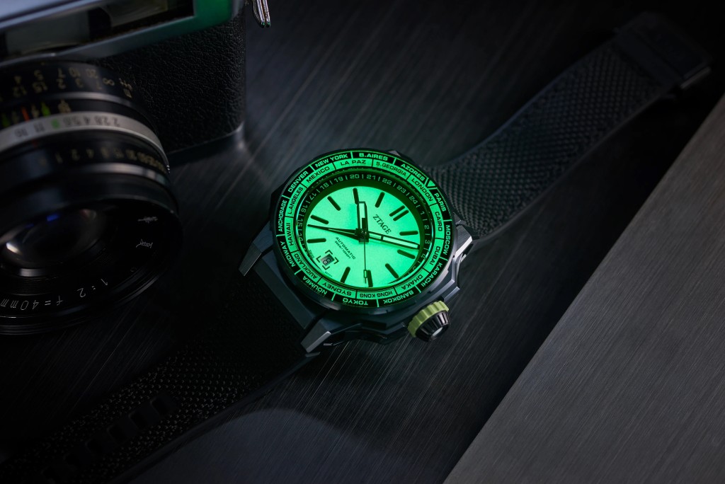 夜光除了应用在指针和时刻上,还可以应用在很多地方。 Ztage以北极光为设计主题的Hybrid Off Ground Aurora,不但采用全夜光表盘,设有全球24个时区代表城市名称的蓝宝石表圈都有全夜光显示,表冠也有颗夜明珠,腕表在夜晚发光的效果,也真如北极光般吸引。