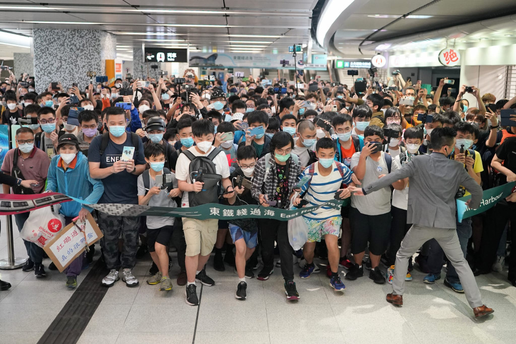 ▲东铁线过海段正式通车当日,港铁清晨在全新车站会展站开出特别头班车,铁路迷衝线入闸,现场非常热闹。