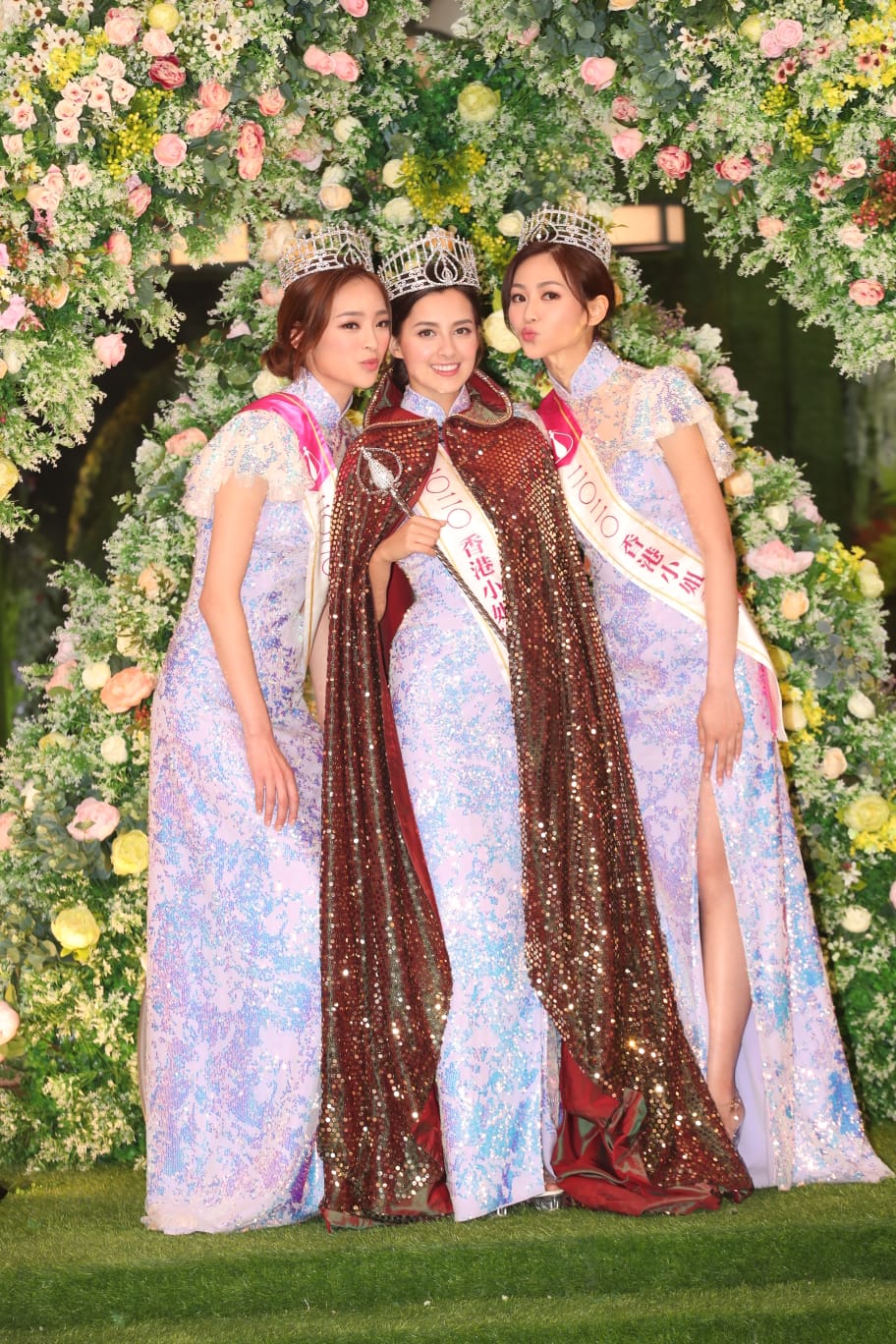 ▲2020年香港小姐冠军谢嘉怡(中)、亚军陈桢怡(左)及季军郭柏妍。