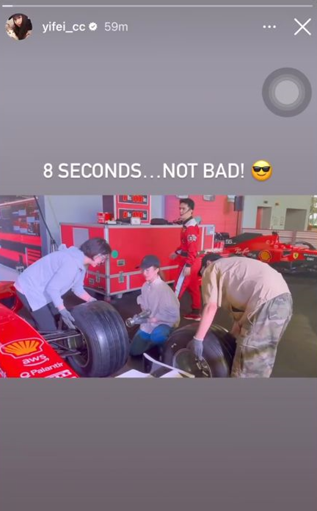 刘亦菲上月29日在IG限时动态上传一段与他人竞赛换F1赛车轮胎的影片,画面中,她戴着棒球帽、护目镜及手套,现身阿布达比F1大奖赛中法拉利车队的维修区,在众人的见证下,先使用轮胎拆装工具卸下轮胎,再迅速拧紧螺母,过程中仅用8秒就成功换好一个赛车轮胎,赢过另一组人马;得知喜讯后,刘亦菲开怀大笑,心情非常高兴。