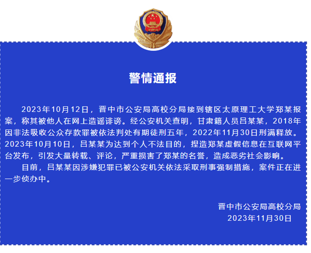 晋中市公安局高校分局11月30日深夜通报称,2023年10月12日,晋中市公安局高校分局接到辖区太原理工大学郑某报案,称其被他人在网上造谣诽谤。经公安机关查明,甘肃籍人员吕某某,2018年因非法吸收公众存款罪被依法判处有期徒刑5年,2022年11月30日刑满释放。2023年10月10日,吕某某为达到个人不法目的,捏造郑某虚假信息在互联网平台发布,引发大量转载、评论,严重损害了郑某的名誉,造成恶劣社会影响。