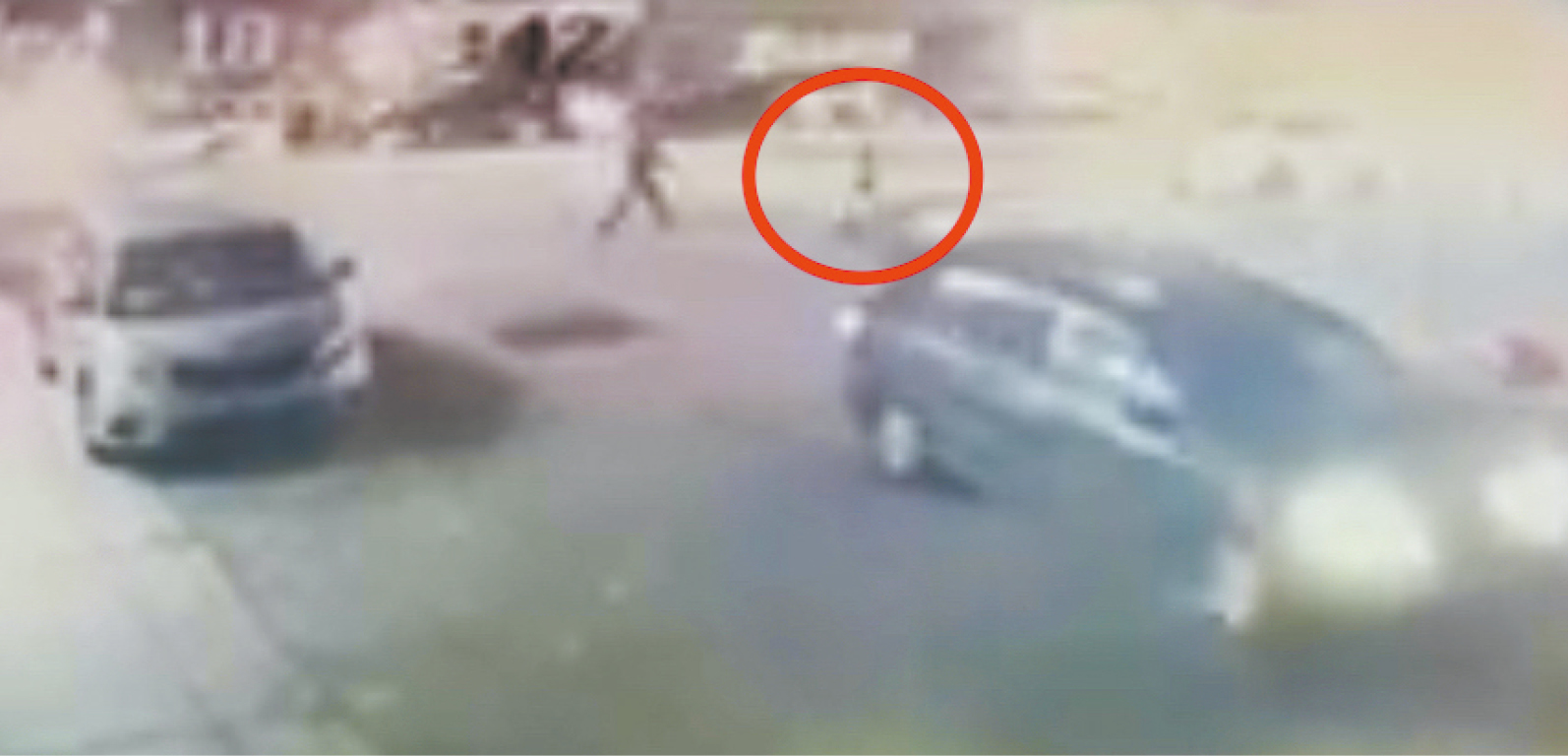 ▲陈昆塔斯(红圈)过马路,随后在路边被一辆白色英菲尼迪轿车撞倒。 知情者提供