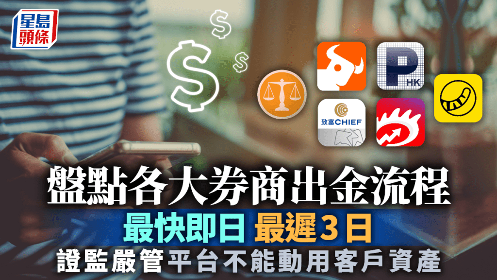 早前有券商平台出金情况惹起大量关注,令不少用户及网民均关心在证券行提款的流程及相关细节。星岛环球网翻查各大券商平台资料发现,其提款截数时间不一,但大部分用户只要在当日截数时间前作出指示,款项也可即日到帐; 惟部份亦需至少1个工作天,并设有提款上限及需为指定银行。 此外,用户也要留意所有股票买卖均需要“T+2”交收,即交易发生当日后的第2个交易日才能交收及作出提款。