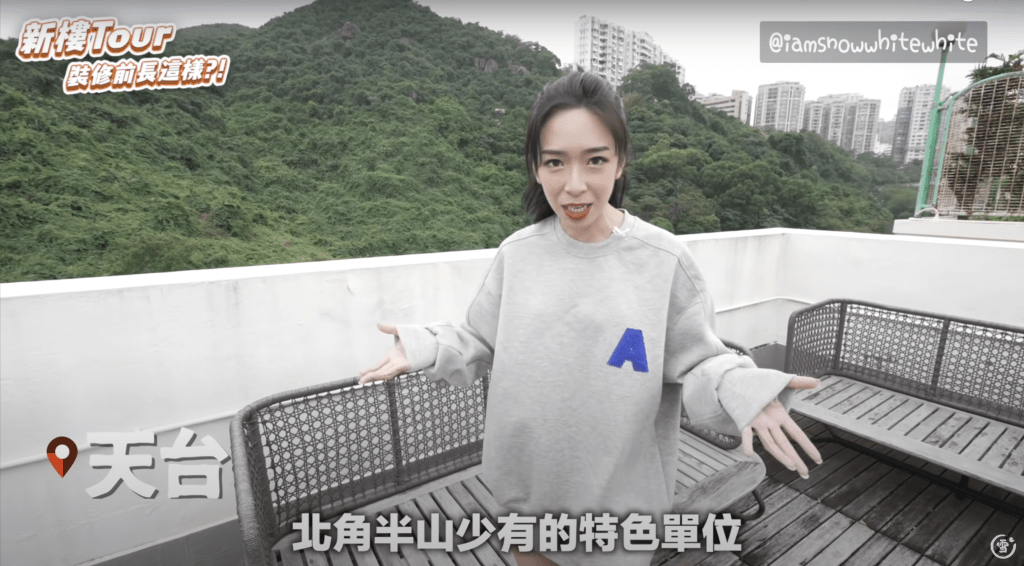 雪姨买入单位后,曾拍片带大家参观她的千万豪宅,片中表示天台面积约1,000方呎,连同室内面积全屋近2,400方呎,单位附新淨装修,景观望开扬山景,她当时计划于天台设露天按摩池以及户外影院。
