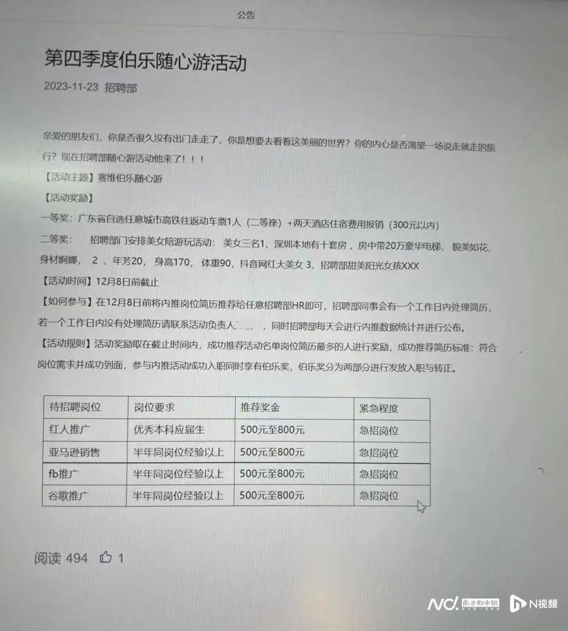网传图片可见,在一份名为“第四季度伯乐随心游活动”的文件上,写明若公司员工在12月8日前将“内推岗位”简历推荐给招聘部人事,成功推荐简历最多者即可获得奖励,其中二等奖是“3名美女陪游玩活动”。