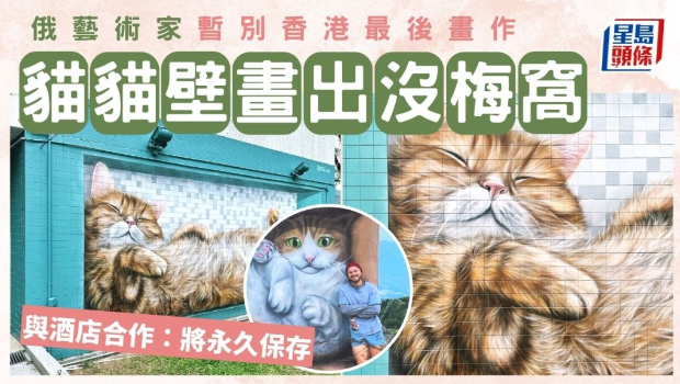 梅窝猫猫壁画|居港俄罗斯艺术家Vladimir以多幅巨型猫猫壁画而在香港闻名,最近他公开与本地一间酒店合作的最新作品,亦是他暂别香港前的最后画作,酒店表示会将画作永久保存,亦欢迎住客尽情欣赏打卡,大家以后都可以随时去探探猫猫啦!
