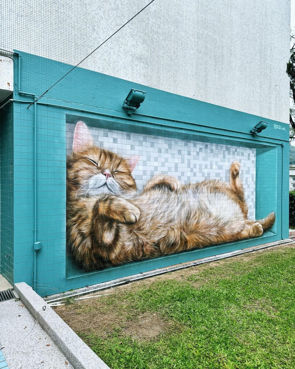 俄罗斯涂鸦艺术家Vladimir Boldyrev近年在香港不同地方创作出多幅猫猫作品,最近受到位于梅窝的银镤湾渡假酒店邀请,在酒店外墙作画,栩栩如生的巨型猫猫神情慵懒,符合酒店悠闲的度假感觉。
