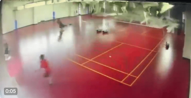 另外一段视频由体育馆内的监控镜头所拍下,学生在打羽毛球,地震时木天花板全部如骨牌般塌下,学生慌忙逃跑,幸无人受伤,场面十分夸张。