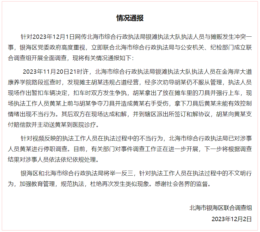 联合调查组称,双方在现场达成和解,胡某向黄某支付赔偿款并送医治疗。针对黄某执法时的不当行为,目前相关部门已对其进行停职调查。