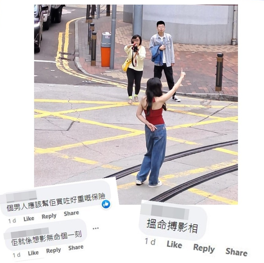 另有网民放狠话指,有可能遭“来回辗过”,估计“顺手拍埋新片《横尸街头》广告宣传照”或“佢就系想影无命嗰一刻(他就是想拍没命的那一刻)”,并猜测望着女子打卡,不时笑微微的同行男子“应该帮佢买咗好重嘅保险(应该帮她买了很重的保险)”。