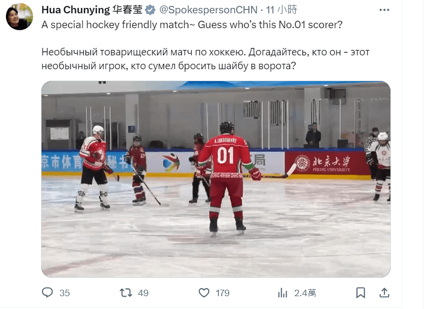 ▲华春莹发布卢卡申科在北京打冰球影片。华春莹@X平台