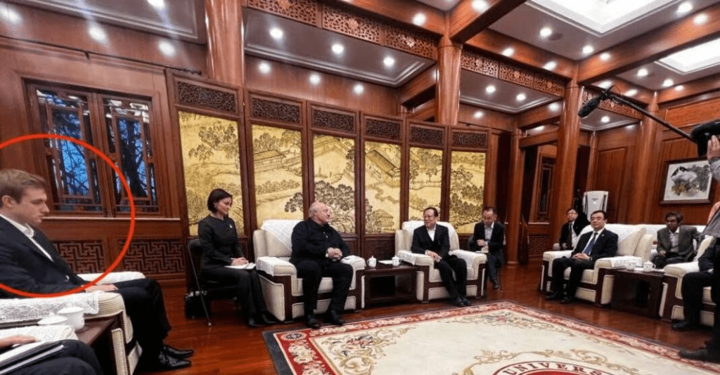 ▲卢卡申科与北京大学党委书记郝平会晤,小儿子尼古拉(红圈)陪同。