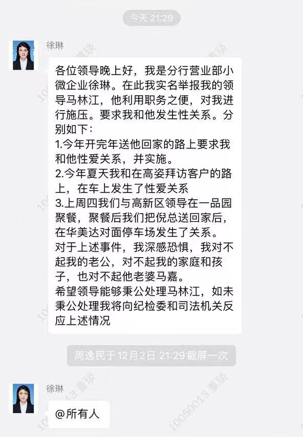 网传聊天记录截图在网上热传。据悉群组内有100多名成员。12月2日晚9时许,一位头像是女性,称为徐琳的员工在群组内发了一段文字,自称是分行营业部员工,实名举报她的上司马林江利用职务之便,对她进行施压,“要求我和他发生性关系”,内文详列每次发生性关系的时间和地点。