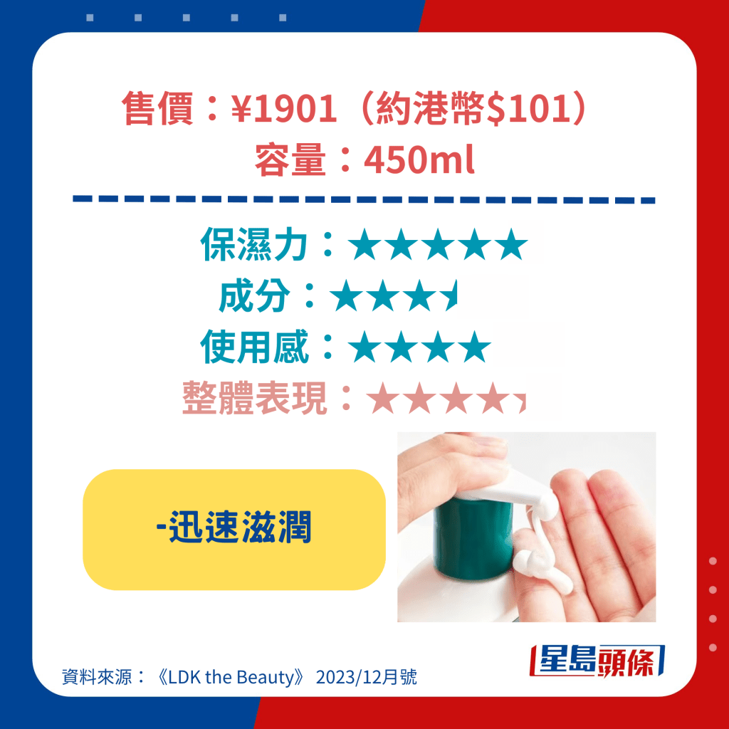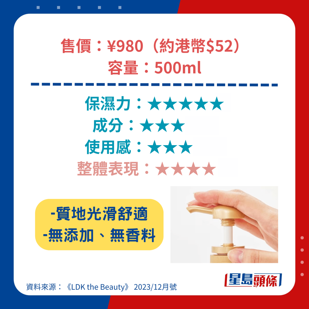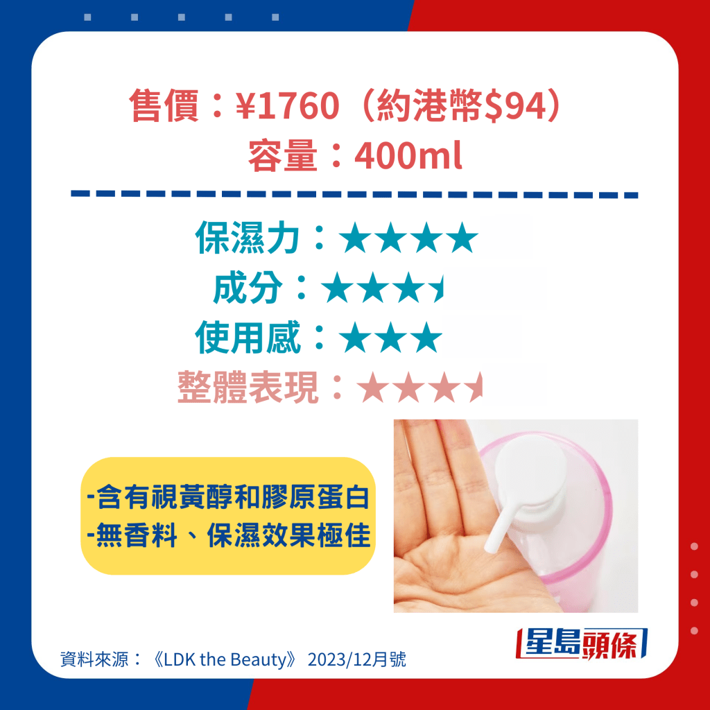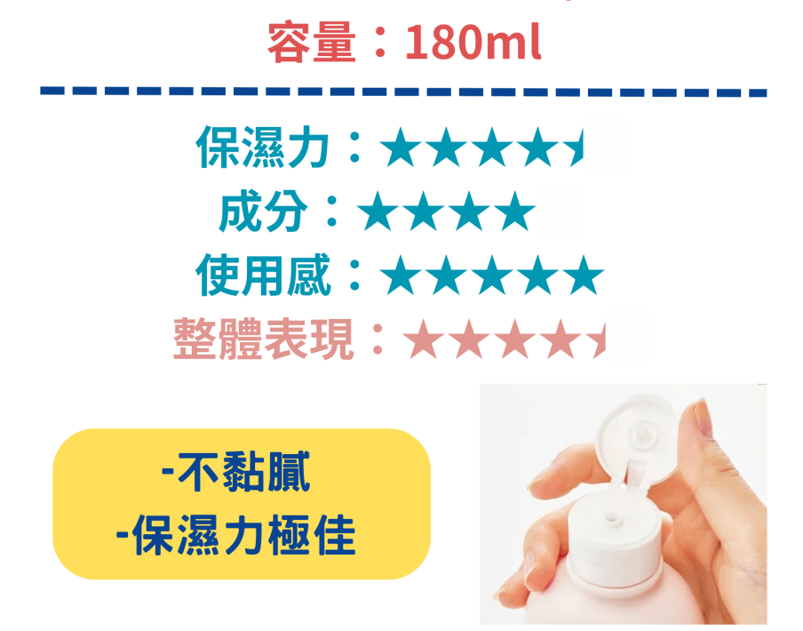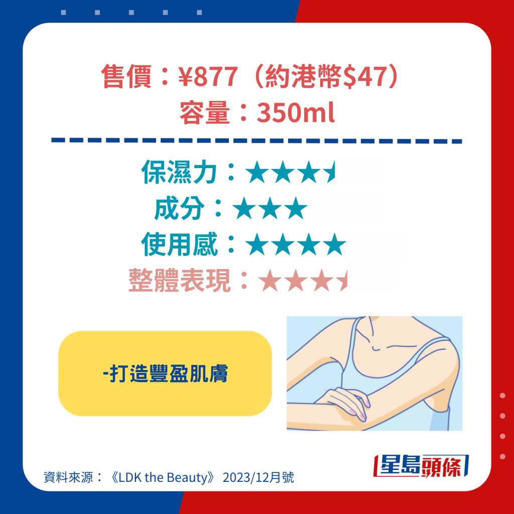 获得最高评分的Ag Deo24身体润肤露含透明质酸等高保湿成分,涂抹起来顺滑不粘腻,另具杀菌、抗氧化等功效,价钱更低至892日元(约44元人民币),成为是次测试中最值得购买的产品。 另一备受关注的雪肌精身体润肤露亦具高保湿力,可以防止肌肤粗糙,其低敏型配方更适用于新生婴儿。