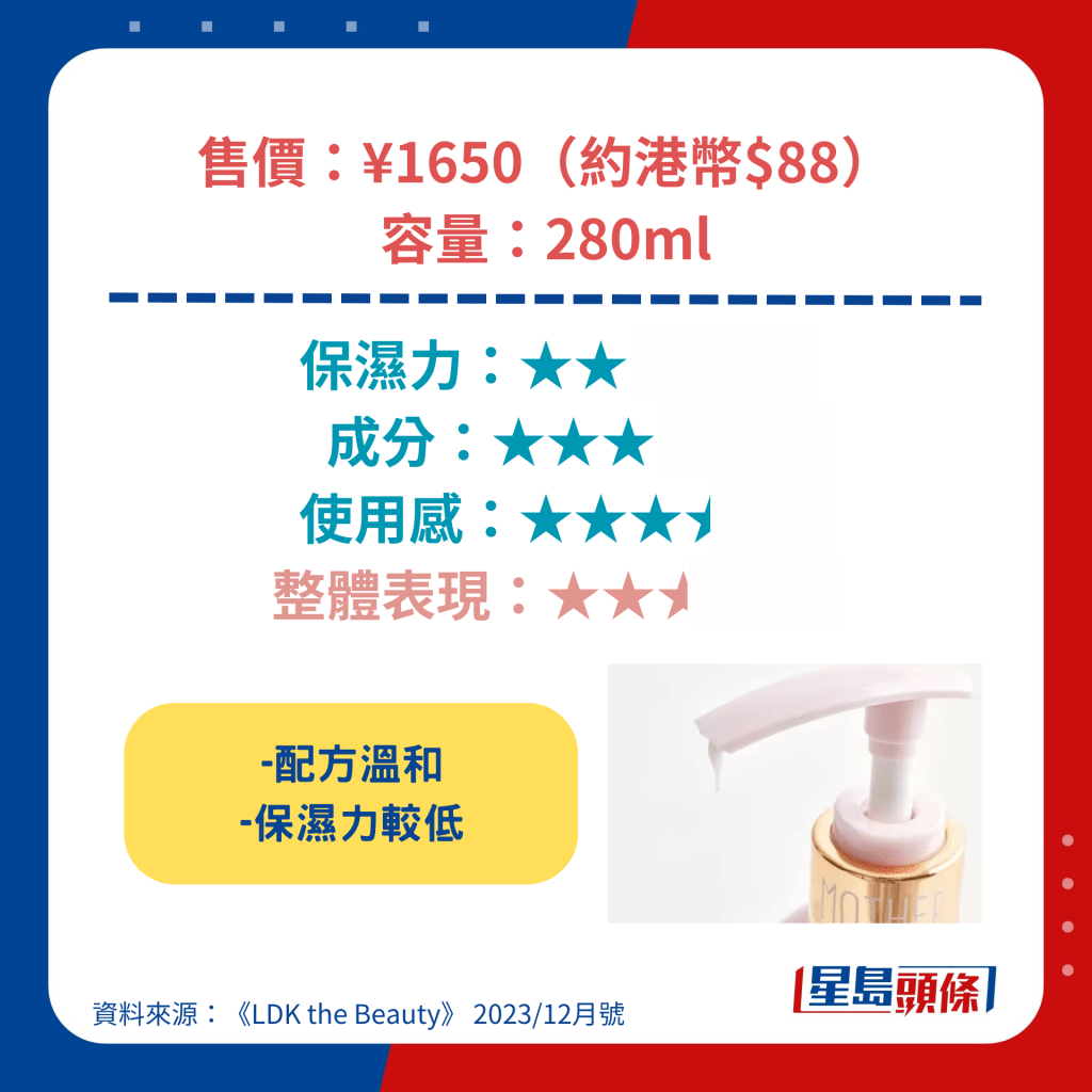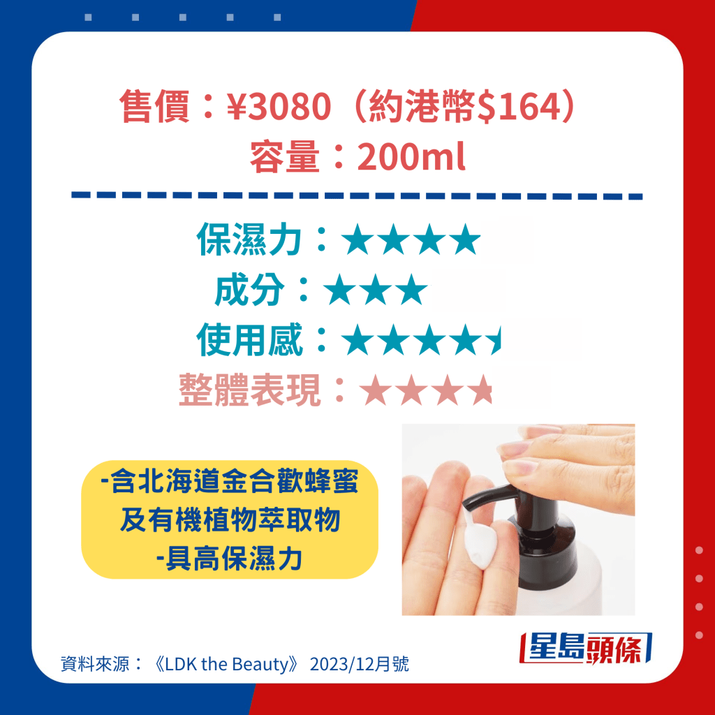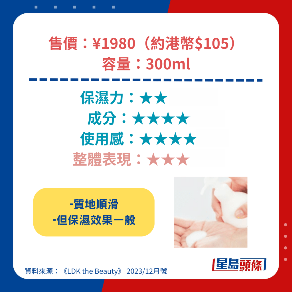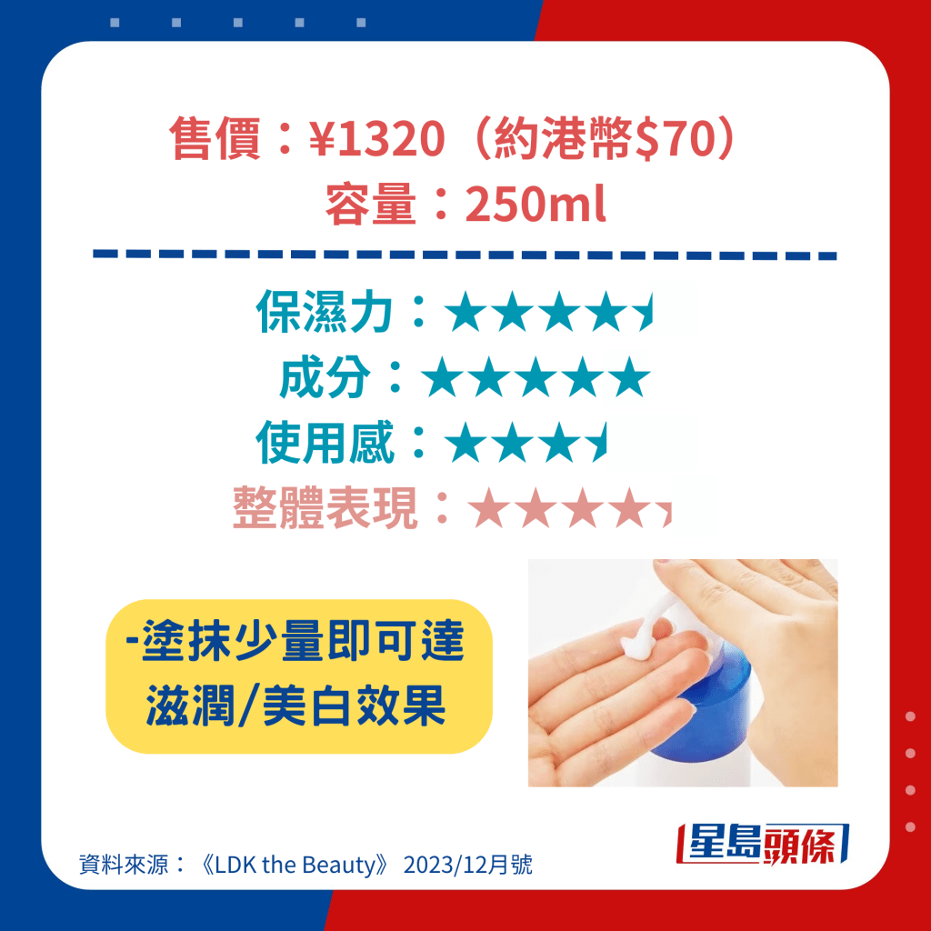 获得最高评分的Ag Deo24身体润肤露含透明质酸等高保湿成分,涂抹起来顺滑不粘腻,另具杀菌、抗氧化等功效,价钱更低至892日元(约44元人民币),成为是次测试中最值得购买的产品。 另一备受关注的雪肌精身体润肤露亦具高保湿力,可以防止肌肤粗糙,其低敏型配方更适用于新生婴儿。